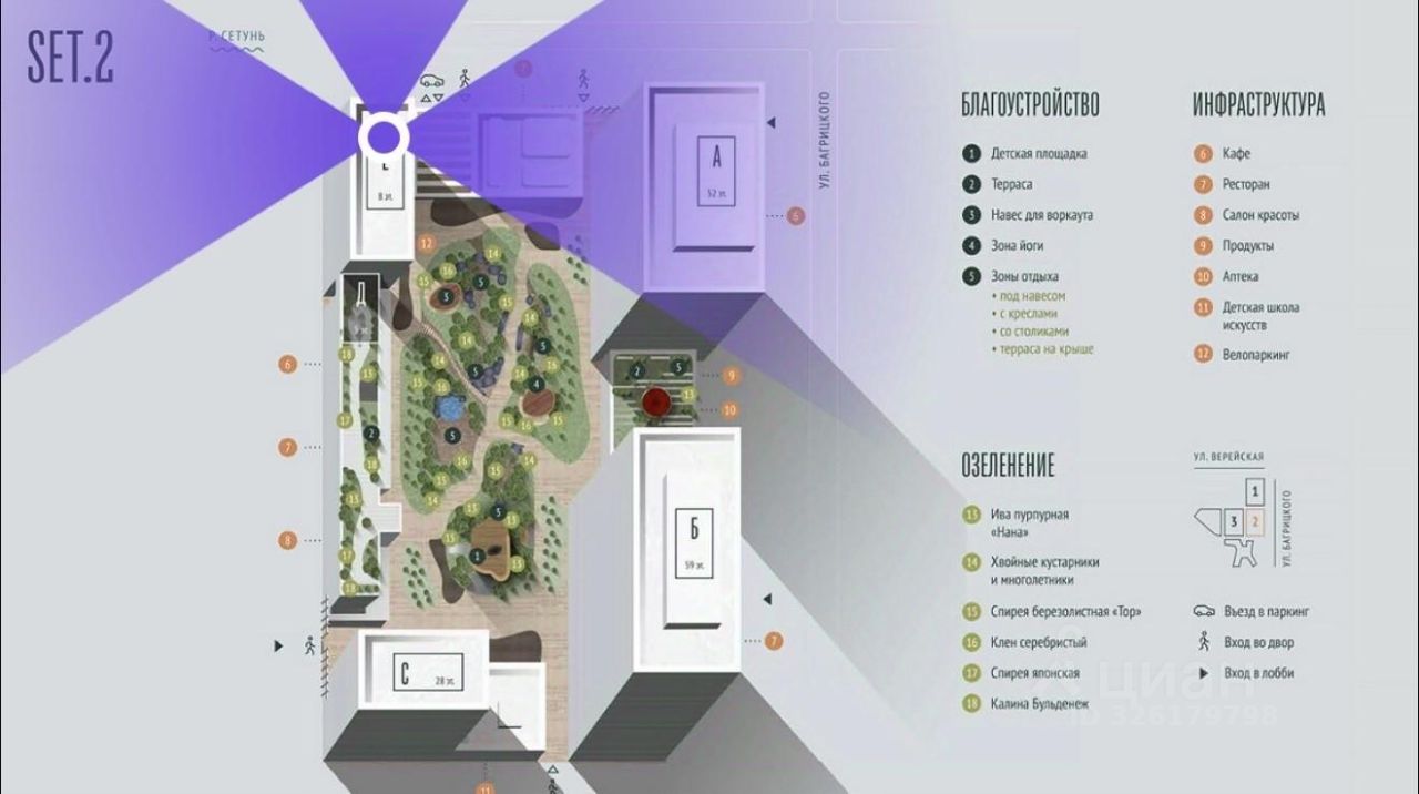 Застройка SET включает в себя не только жилые корпуса, но и инфраструктурные объекты. Все необходимое для повседневного комфорта будет расположено в шаговой доступности: