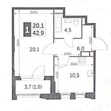 Общая площадь квартиры по ЕГРН 41,5 кв.м, с учетом лоджии ( с коэффициентом)- 43,3 кв.м. Просторная лоджия из комнаты 3,6 кв.м, без отделки.