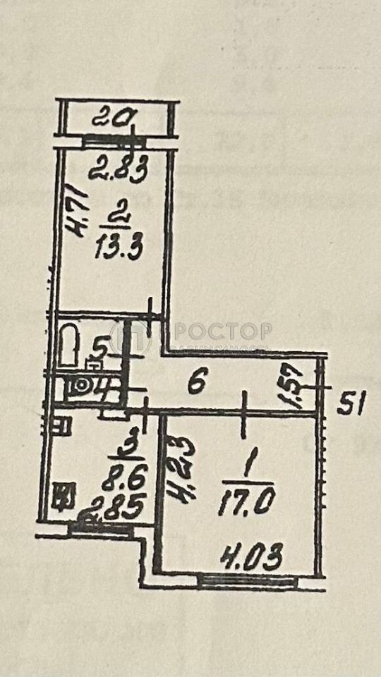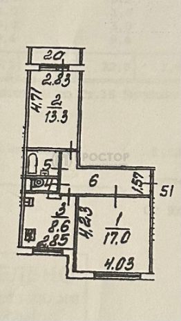 - общая площадь 52м², жилая 30.3м², комнаты 17,0м²+13,3м², кухня 8,6м²