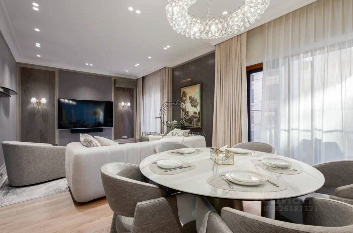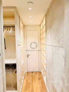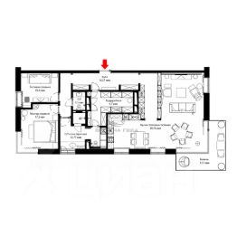 Планировочное решение: кухня с обеденной зоной и гостиной с выходом на балкон, две спальни, два санузла, гардеробная комната, холл