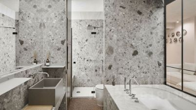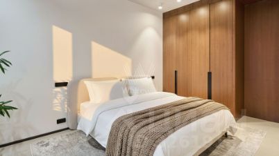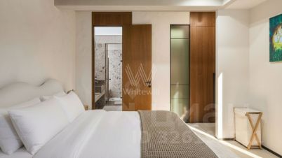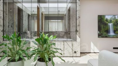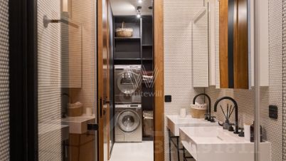 Апартаменты с дизайнерской отделкой в современном стиле. В оформлении использованы фактуры дерева и гранита. Высота потолков 3,1 метра. Планировка включает просторную кухню-гостиную с обеденной и ТВ зонами, две спальни, кабинет, два санузла, гардеробную, кладовую и холл.