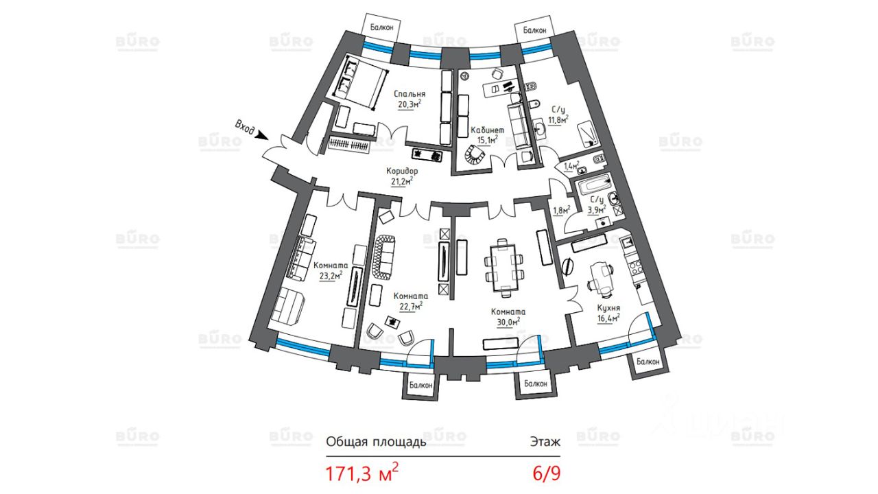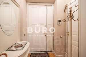 Площадь квартиры 171,3 кв.м., кухня 16,4 кв.м., гостиная из двух частей 30+22,7 кв.м., спальня 20,3 кв.м, кабинет 15,1 кв.м. и барная комната 23,2 кв.м., три санузла с душевой кабиной и ванной, в прихожей есть гардеробная комната, три балкона с видовыми характеристиками на Тверскую улицу и Кремль.