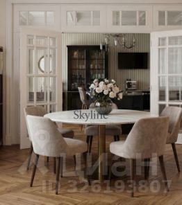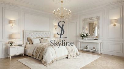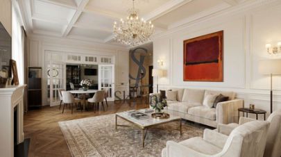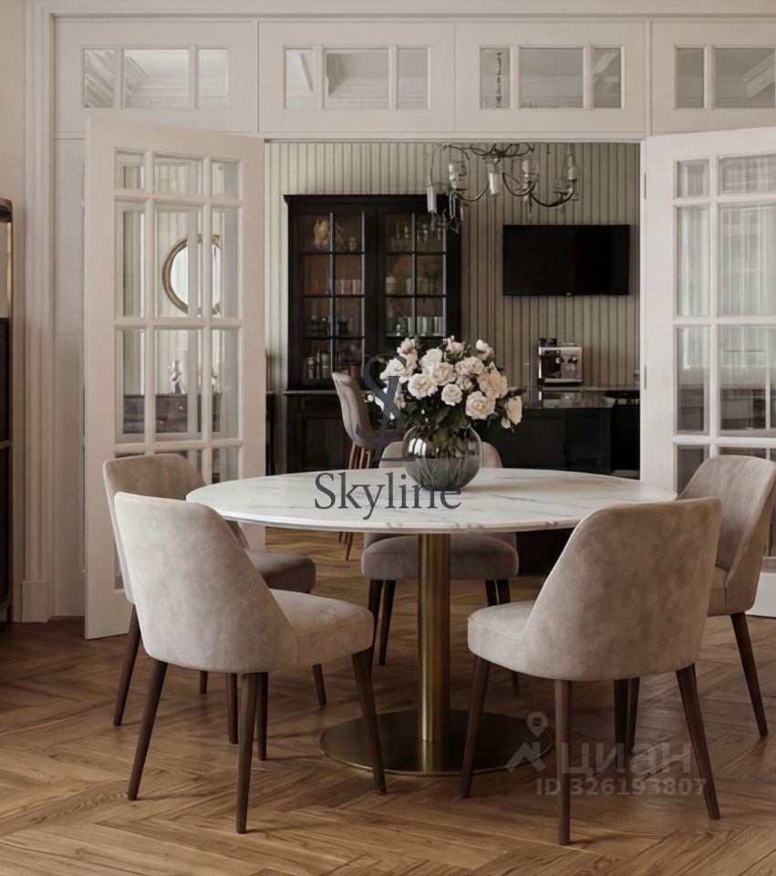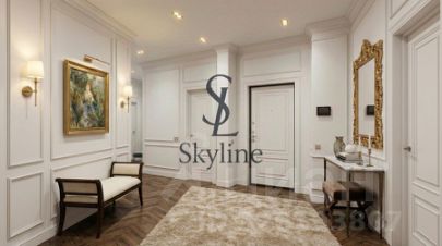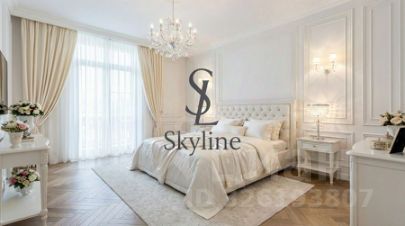 Просторная площадью 201 м², она занимает достойное место на пятом этаже и впечатляет авторской отделкой, выполненной в элегантном неоклассическом стиле. Интерьер