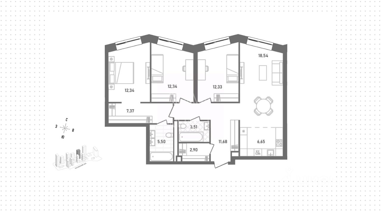 Просторная квартира с 3 спальнями общей площадью 94 м² в комплексе премиум-класса Republic на Пресне. Квартира без отделки расположена на 14 этаже в корпусе Platinum. Планировка: кухня-гостиная, мастер-спальня со своей ванной комнатой и гардеробной, 2 спальни, ванная комната, прихожая с гардеробной. Окна ориентированы на северо-запад.