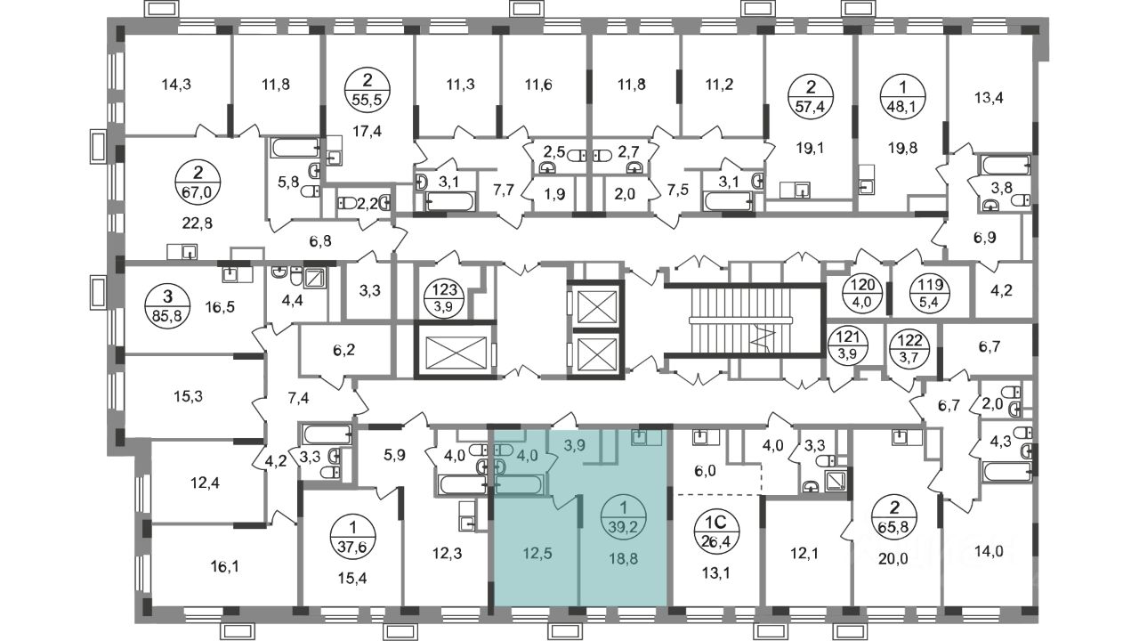 Общая площадь квартиры - 39,2 кв. м, этаж 6 из 19.