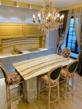 Кухня Guila Novars, есть вся необходимая встроенная бытовая техника, пол с подогревом по всей квартире и в санузлах, установлены кондиционеры, стиральная машина с сушкой, драпировка всех стен выполнена итальянскими тканями.