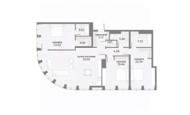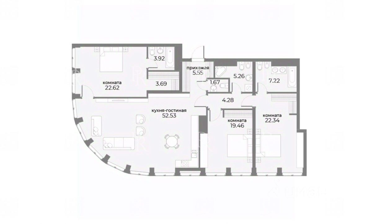 Планировка: кухня-гостиная-столовая, две мастер спальни с ванной и гардеробной комнатами, спальня, гостевой санузел, гардеробная.