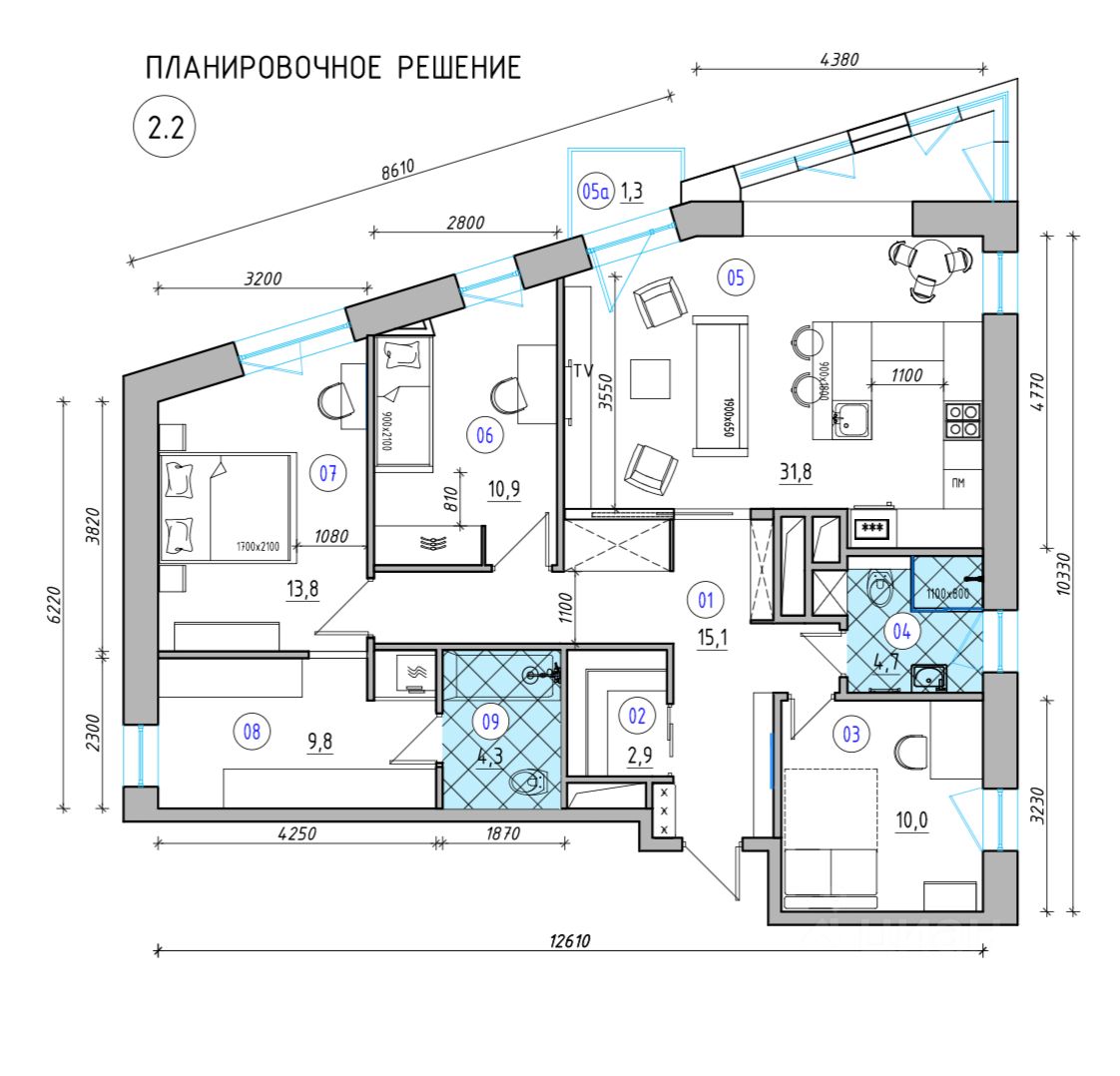 - функциональная планировка: пространство квартиры с 9-ю окнами, проектная планировка представлена с 3 спальнями, можно также сделать 2 и 4 спальни, 2-мя санзулами, 2-мя гардеробными, местами хранения и большей кухней-столовой-гостиной с 3 окнами площадью 32 м2 и балконом;