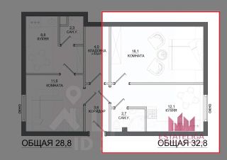 • Площадь 32,8м² с хорошей планировкой: 1 изолированная комната, просторный коридор, кухня 12м².