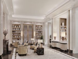 Архитектурное бюро Олега Клодта разработало дизайн общественных пространств FIVE TOWERS: гранд-лобби, камерную библиотеку c камином и лифтовую зону. Все необходимые сервисы сосредоточены на первых этажах небоскрёба: кафе, винотека, салон красоты, фитнес и детский клуб. Приватный Sky Club 49 — респектабельный лаундж с открытой террасой и ограниченным доступом на 49 этаже — только для резидентов.