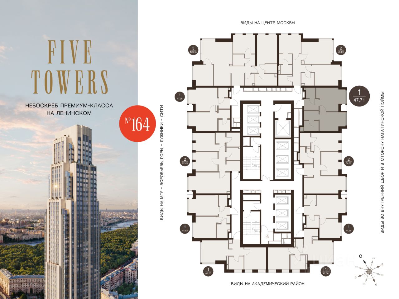 FIVE TOWERS — первый жилой небоскрёб на Ленинском проспекте и самый высокий дом столицы за пределами делового кластера "Москва-Сити". Премиальный небоскрёб представляет собой ультрасовременное, высокотехнологичное здание, идеальный синтез стилей культовых высоток Москвы и небоскребов Нью-Йорка и поражает воображение уникальными видами, монументальной роскошью и совершенством форм. Величественная панорама, открывающаяся из окон вашей квартиры, завораживает: легендарные сталинские высотки, шпиль главного корпуса МГУ, "Москва-Сити", спорткомплекс "Лужники".