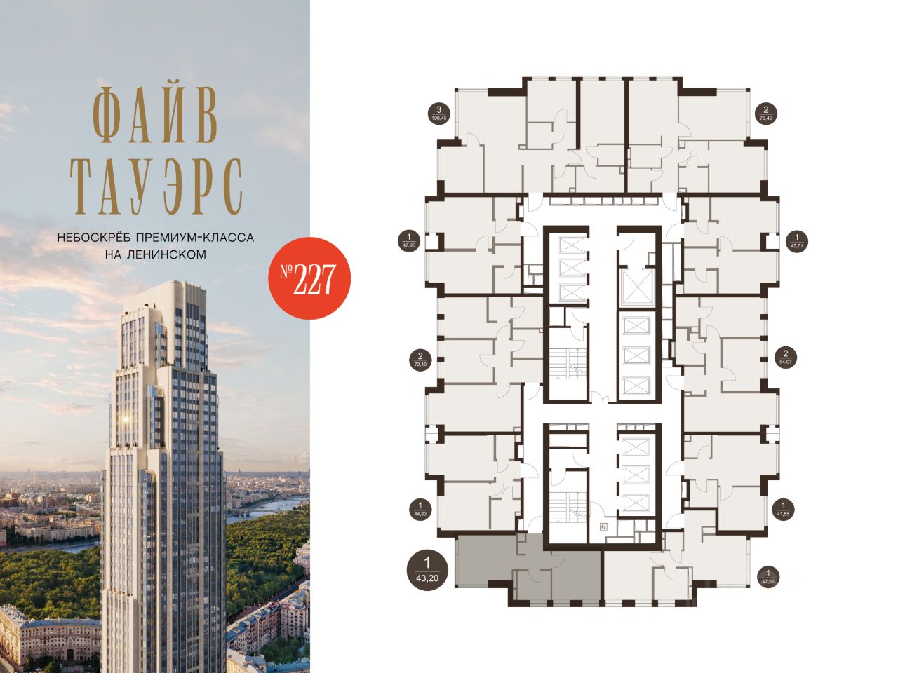 ФАЙВ ТАУЭРС — первый жилой небоскрёб на Ленинском проспекте и самый высокий дом столицы за пределами делового кластера "Москва-Сити". Премиальный небоскрёб представляет собой ультрасовременное, высокотехнологичное здание, идеальный синтез стилей культовых высоток Москвы и небоскребов Нью-Йорка и поражает воображение уникальными видами, монументальной роскошью и совершенством форм. Величественная панорама, открывающаяся из окон вашей квартиры, завораживает: легендарные сталинские высотки, шпиль главного корпуса МГУ, "Москва-Сити", спорткомплекс "Лужники".