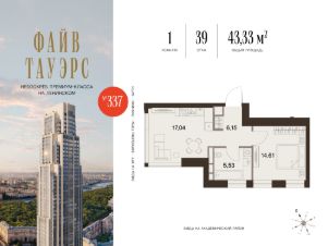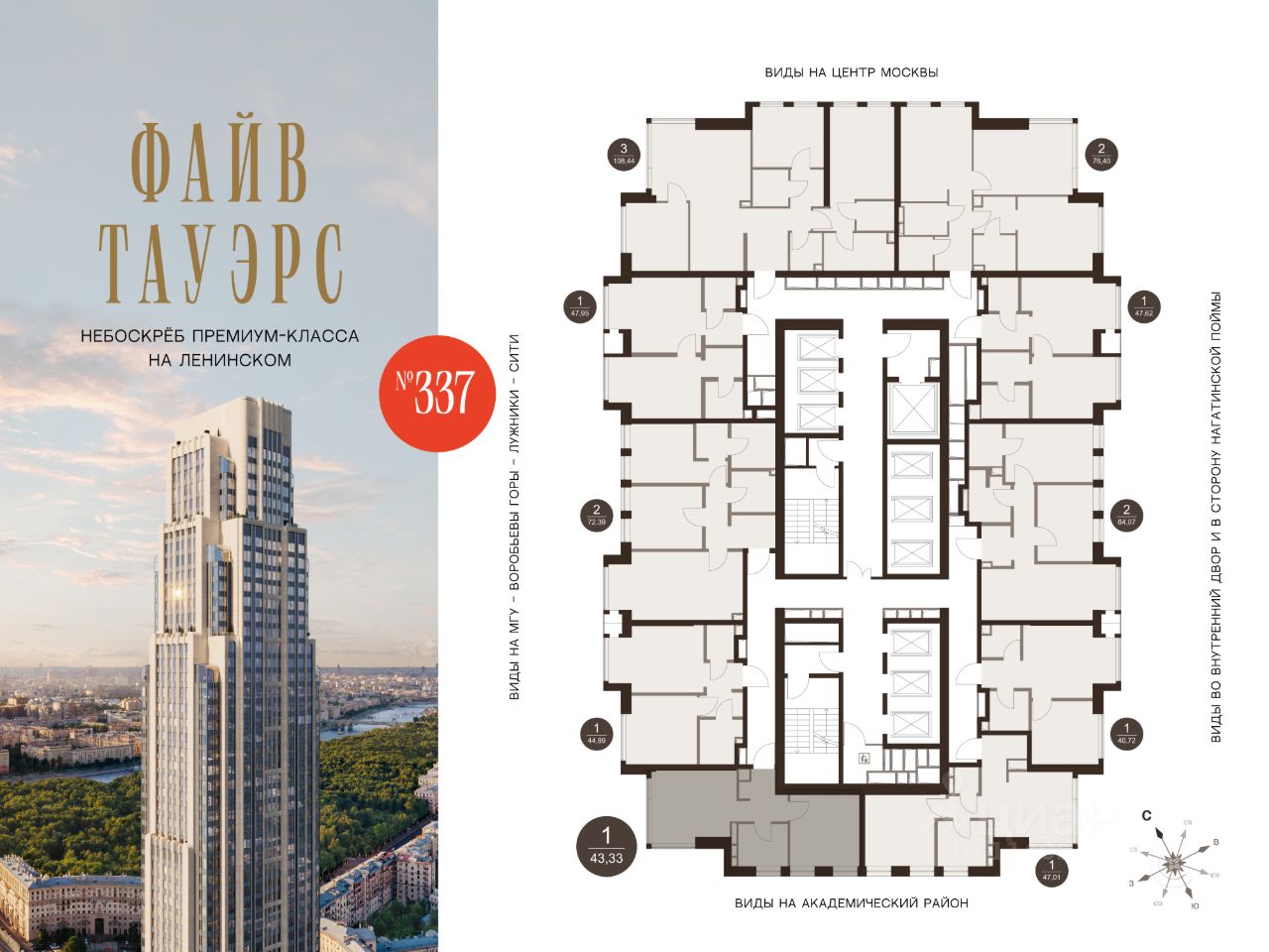 Гибкие программы рассрочки: 0% без переплат и удорожания; первый взнос от 10%. О проекте ФАЙВ ТАУЭРС — первый жилой небоскрёб на Ленинском проспекте и самый высокий дом столицы за пределами делового кластера "Москва-Сити". Премиальный небоскрёб представляет собой ультрасовременное, высокотехнологичное здание, идеальный синтез стилей культовых высоток Москвы и небоскребов Нью-Йорка и поражает воображение уникальными видами, монументальной роскошью и совершенством форм. Величественная панорама, открывающаяся из окон вашей квартиры, завораживает: легендарные сталинские высотки, шпиль главного корпуса МГУ, "Москва-Сити", спорткомплекс "Лужники". Окружение 75-этажный жилой комплекс премиум-класса расположен в историческом Донском районе. Транспортная инфраструктура проекта сделает жизнь резидентов ФАЙВ ТАУЭРС комфортной и продуманной: удобные выезды на ТТК и Садовое кольцо, 10 минут до метро "Ленинский проспект", 11 минут на МЦК до Москва-Сити. Рядом расположены крупные деловые и бизнес-центры, а в шаговой доступности — 500 га парков, образуемых Музеоном, Парком Горького и парком "Воробьевы горы". Инфраструктура Архитектурное бюро Олега Клодта разработало дизайн общественных пространств ФАЙВ ТАУЭРС: гранд-лобби, камерную библиотеку c камином и лифтовую зону. Все необходимые сервисы сосредоточены на первых этажах небоскрёба: кафе, винотека, салон красоты, фитнес и детский клуб. Приватный Sky Club 49 — респектабельный лаундж с открытой террасой и ограниченным доступом на 49 этаже — только для резидентов. Квартиры в ФАЙВ ТАУЭРС Все квартиры в ФАЙВ ТАУЭРС будут сданы с предчистовой отделкой (white box). Это позволит будущим резидентам комплекса сосредоточиться на творческой части ремонта, не связанной с организацией черновых работ. В жилом небоскребе ФАЙВ ТАУЭРС запланировано 596 премиальных квартир и 87 типов планировочных решений, которые можно адаптировать под личные запросы и сценарии проживания. В комплексе премиум-класса представлены не только двух- и трехкомнатные квартиры с угловым остеклением, но и однокомнатные с видом на две стороны и трехкомнатные квартиры с видами на три стороны, что является редким предложением на рынке недвижимости.