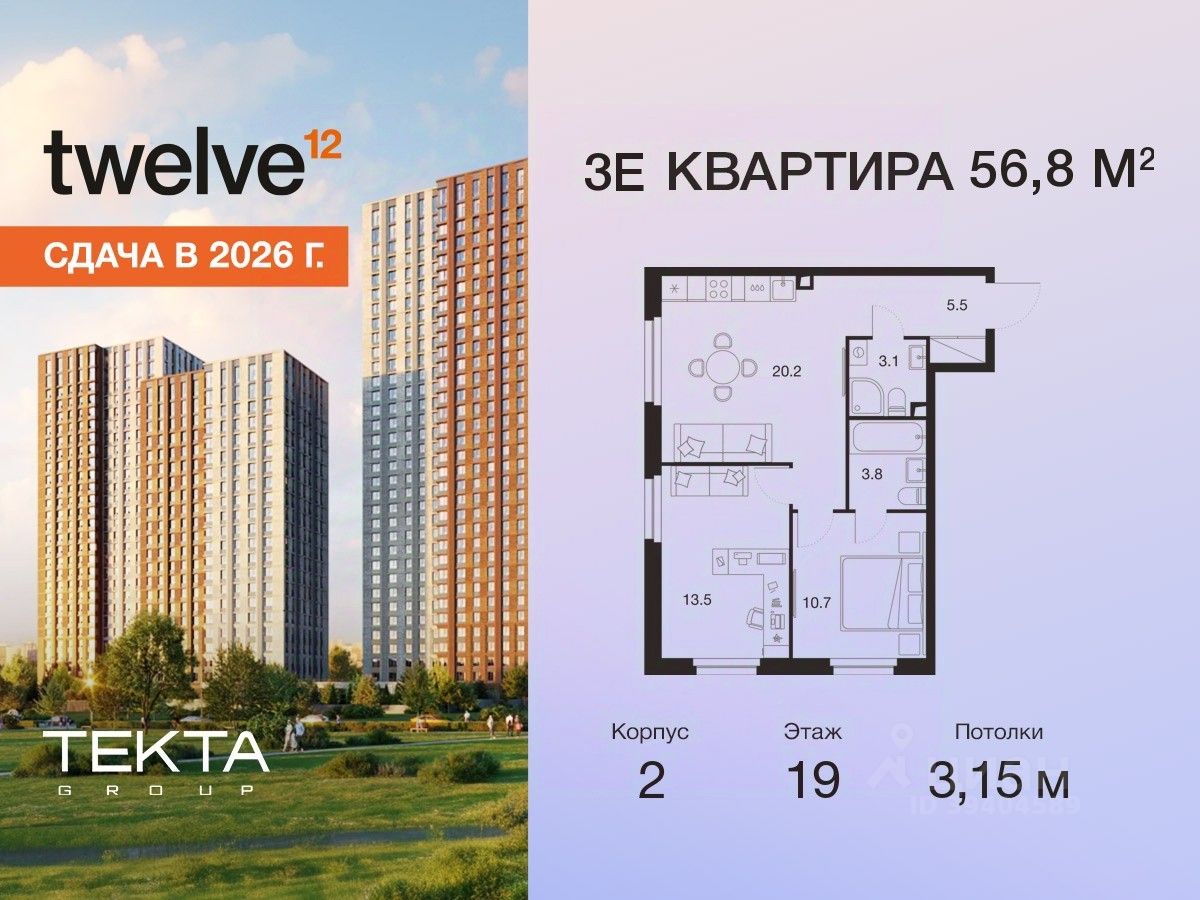 3-комн. квартира в ЖК "Твелв" на 19 этаже в 22 этажном здании Корпус 2. Общая площадь: 56.8 кв.м., жилая: 37.60 кв.м. Высота потолков 3.15 м.