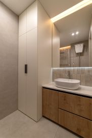 В мастер-спальне санузел с ванной, в другом санузле установлена душевая кабина и блок прачечной (стиральной и сушильной машин).