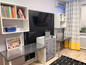 Детская: качественная мебель (Cilek Турция) рассчитана на проживание 2х детей, 2х этажная кровать, 2 шкафа, письменные столы, имеется скалодром и спортивный уголок, выход на лоджию.