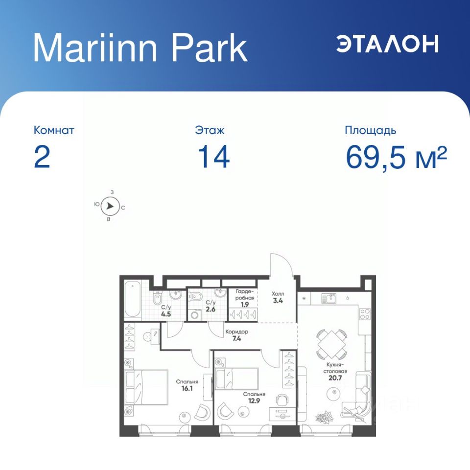 Общая площадь квартиры — 69.5 кв. м, этаж 14 из 16.