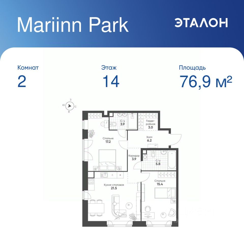 Общая площадь квартиры — 76.9 кв. м, этаж 14 из 16.
