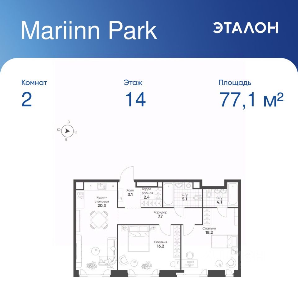 Общая площадь квартиры — 77.1 кв. м, этаж 14 из 16.