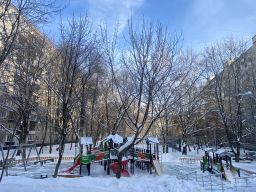 Большой зеленый двор с разнообразными детскими и спортивными площадками.