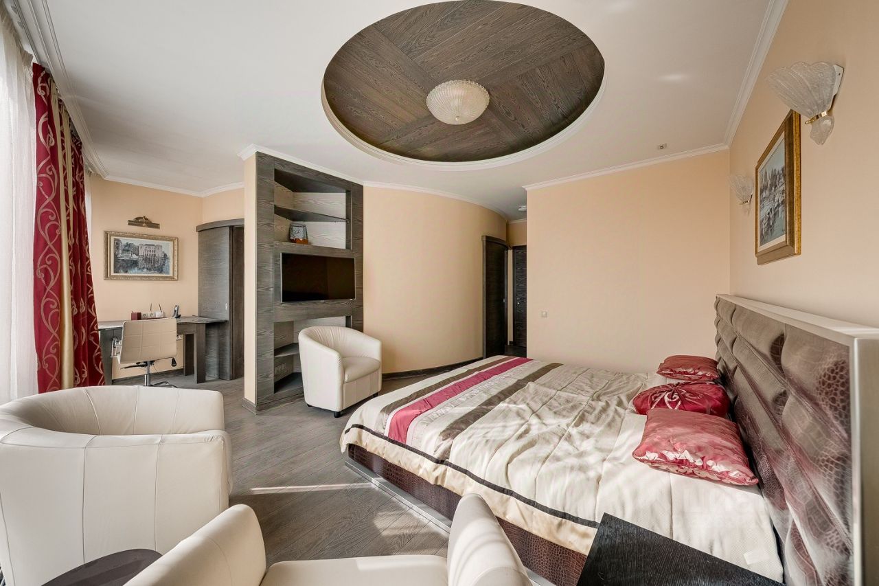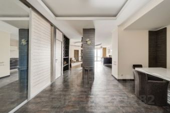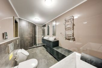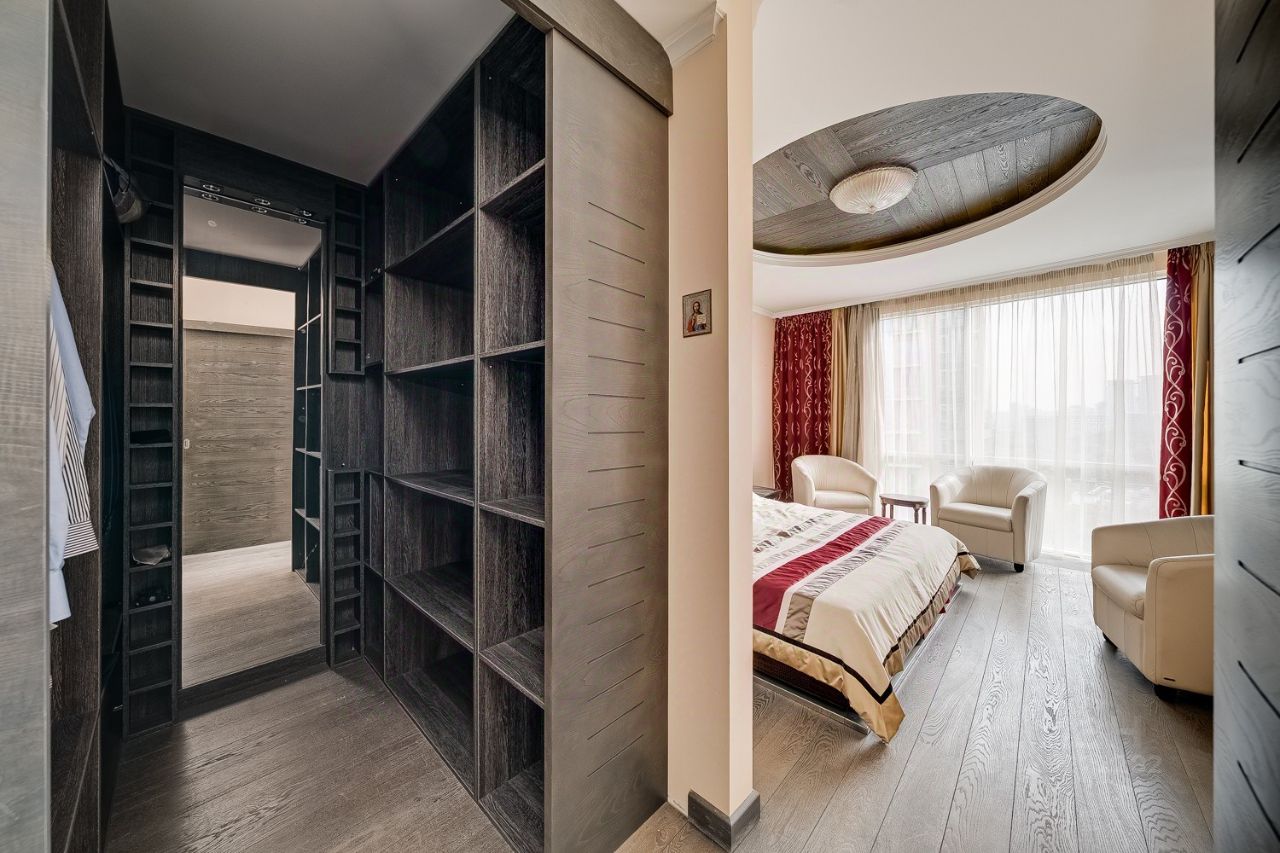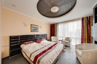 Она имеет удачную функциональную планировку: просторная кухня-гостиная с зоной отдыха возле панорамного окна и балкона, на которой вы будете с удовольствием готовить и принимать гостей; при входе - прихожая с местом для переговоров и вместительным шкафом-купе, гостевой с/у с душевой кабиной, стеллаж для вашей книжной коллекции; хозяйская зона состоит из уютной и светлой мастер-спальни с панорамным окном, большим с/у с ванной и душевой, гардеробной и интегрированным в лоджию кабинетом.