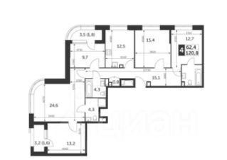 Общая площадь квартиры составляет без учета лоджий 117,4 кв. м, +две остекленные лоджии 3,2 кв.м. и 3,5 кв.м, 4 изолированные комнаты: 12,7 спальня со своим санузлом, гостиная 15, 4 кв.м., спальня 9,7 (можно сделать кабинет), мастер спальня 24,6 кв.м. со своим санузлом и просторной гардеробной 13,2 кв.м., есть гостевой санузел. Так же можно при необходимости сделать 5-ти компактную квартиру или оборудовать большую кухню-гостиную. Поскольку квартира свободной планировки и не имеет стен, можно сделать любую планировку по желанию и воплотить в жизнь любую идею.