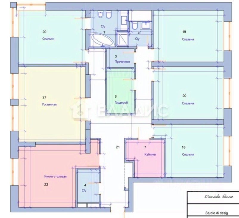 Выполнена премиальная отделка по проекту итальянского дизайнера Davide Ricco с использованием высококачественных материалов (гипс, дубовый паркет, мрамор, гранит, позолота, бесшовные шелковые и текстильные обои, шторы из натурального шелка и бархата).