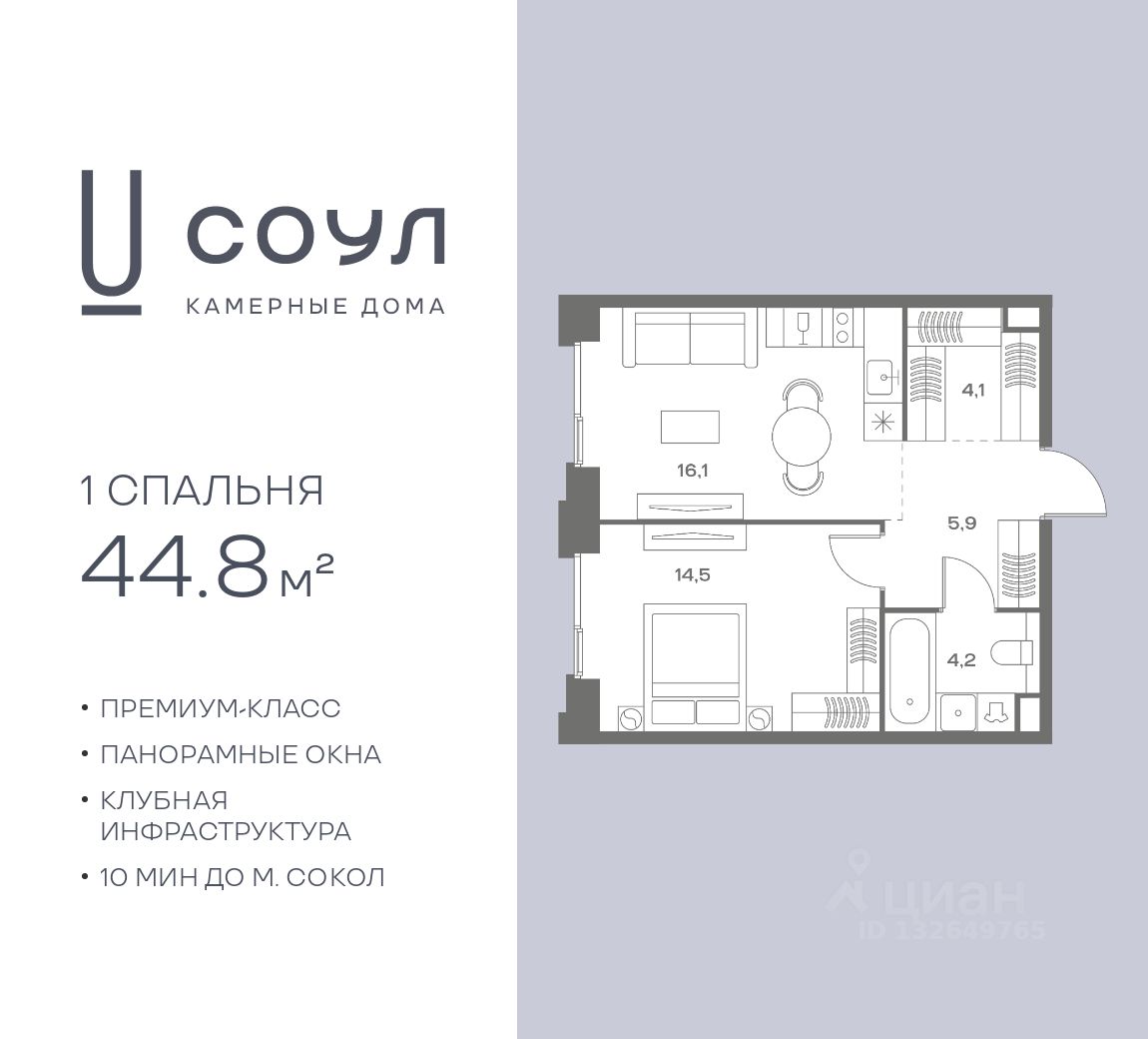 Продается 1-к. квартира номер 115 общей площадью 44.8 кв.м. на 6-м этаже 8 этажного дома, камерные дома СОУЛ (премиум-класс). Без отделки.