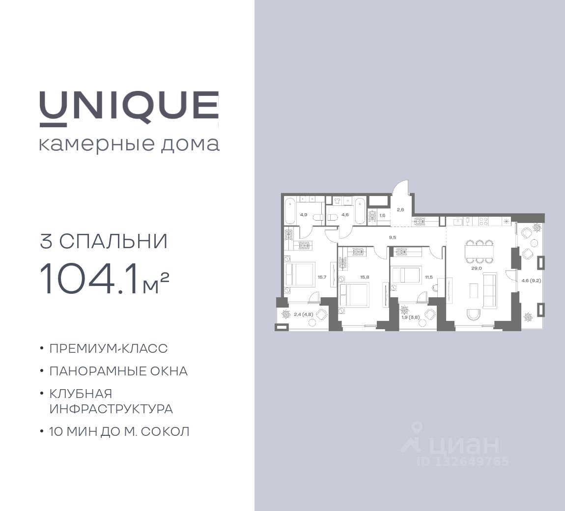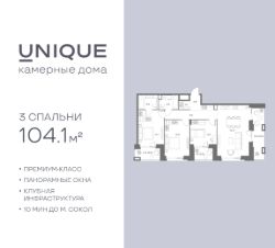 Продается 3-к. квартира номер 168 общей площадью 104.1 кв.м. на 6-м этаже 9 этажного дома, корпус UNIQUE (премиум-класс). Без отделки.