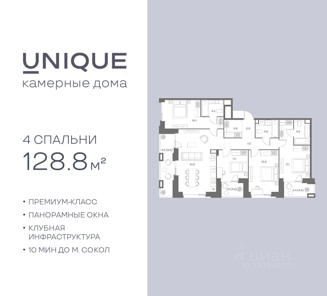 Продается 4-к. квартира номер 209 общей площадью 128.8 кв.м. на 4-м этаже 9 этажного дома, корпус UNIQUE (премиум-класс). Без отделки.