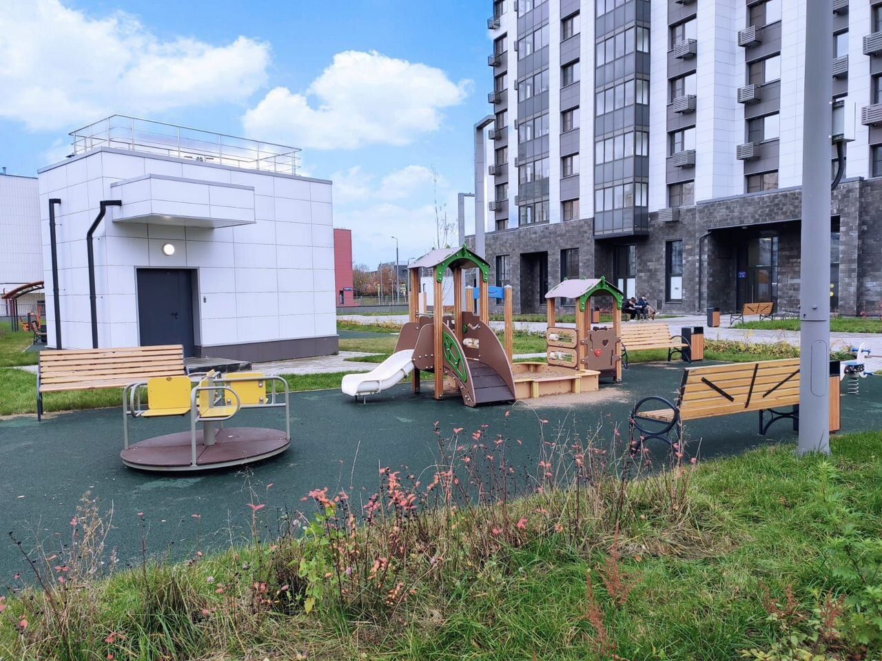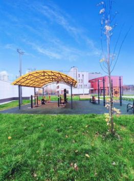 - Во дворе современные, оборудованные и безопасные спортивные и детские площадки, комфортное пространство двор без машин, зеленые зоны с лавочками, деревьями, кустарниками и цветниками