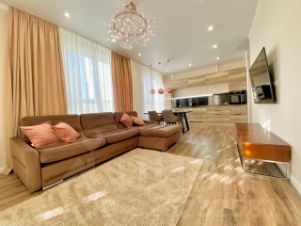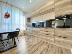 - Кухня-гостиная полностью укомплектована бытовой техникой, вся она в рабочем состоянии. Кухонный гарнитур выполнен на заказ, обеденный стол и мягкий диван