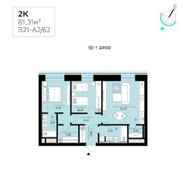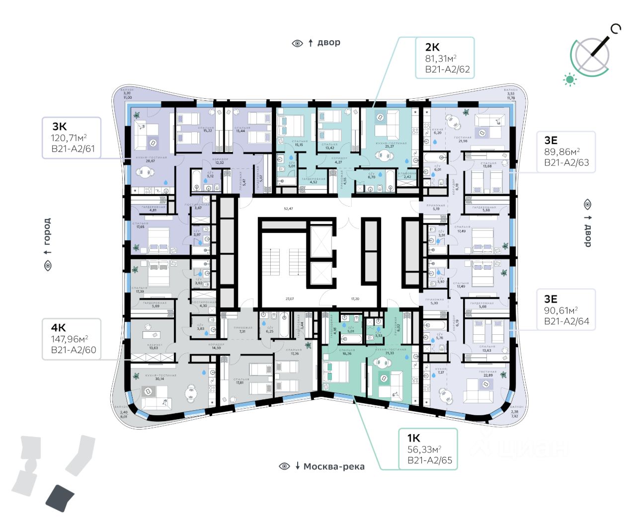 В продаже — двухкомнатная квартира, общей площадью 81,31 кв. м. Квартира расположена на одинадцатом этаже тринадцатиэтажной секции корпуса класса Адвансд в новом районе СберСити, который строит Сбер. Дом находится на второй береговой линии Москвы-реки.
