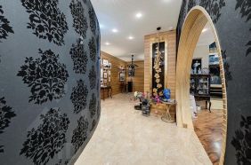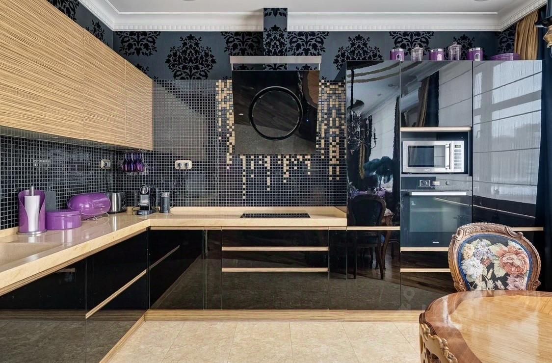В отделке холлов использован, шпон зебрано, так же как и на кухонных фасадах. В общих зонах использовано контрастное сочетание чёрных обоев с крупным флоковым раппортом и золотых обоев.