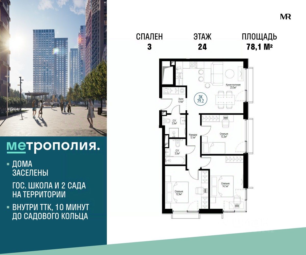 Продаётся 3-комнатная квартира общей площадью 78.10 м², на 24 этаже.