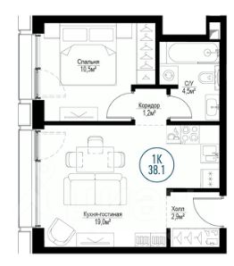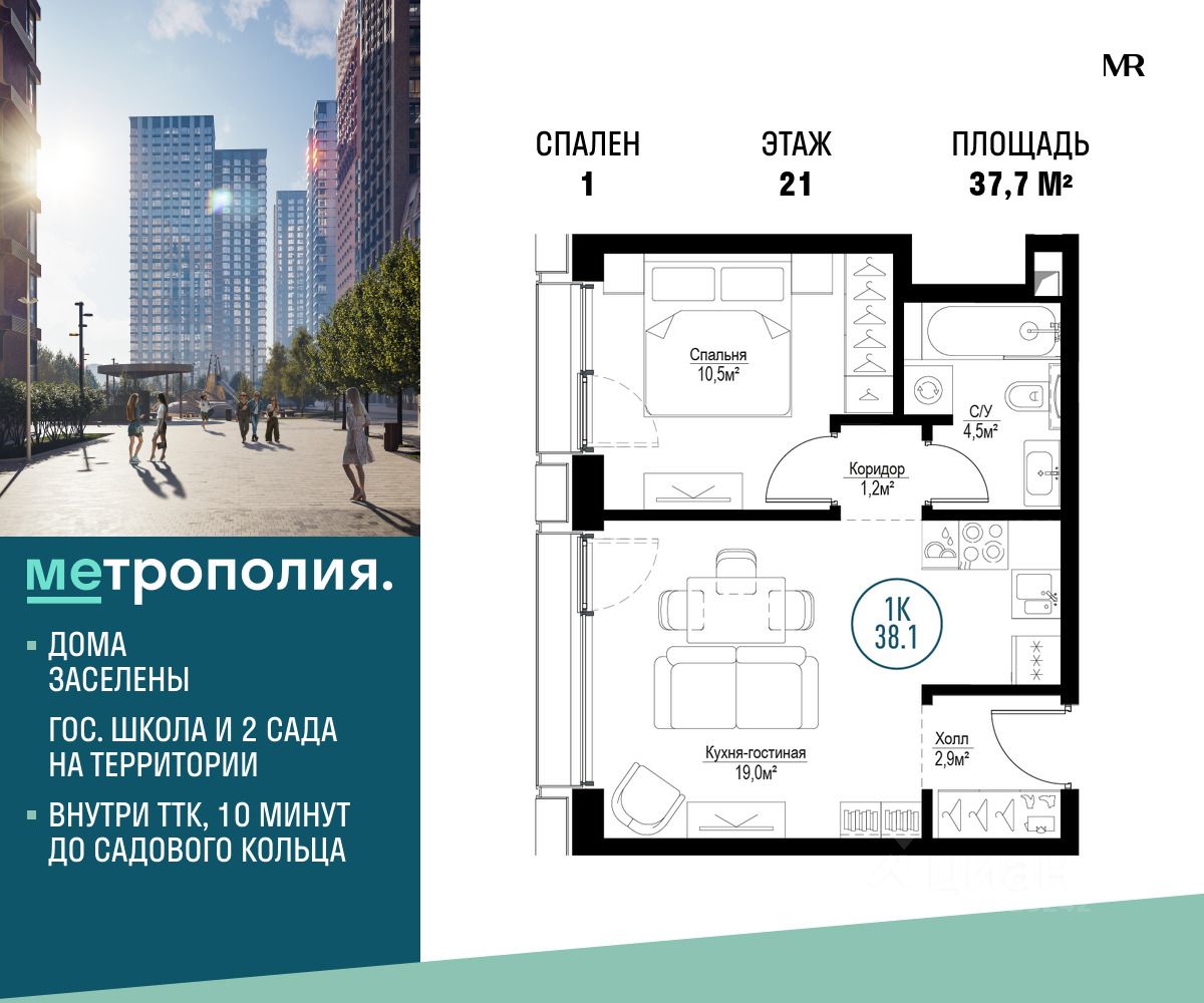 Продаётся 1-комнатная квартира общей площадью 37.70 м², на 21 этаже.