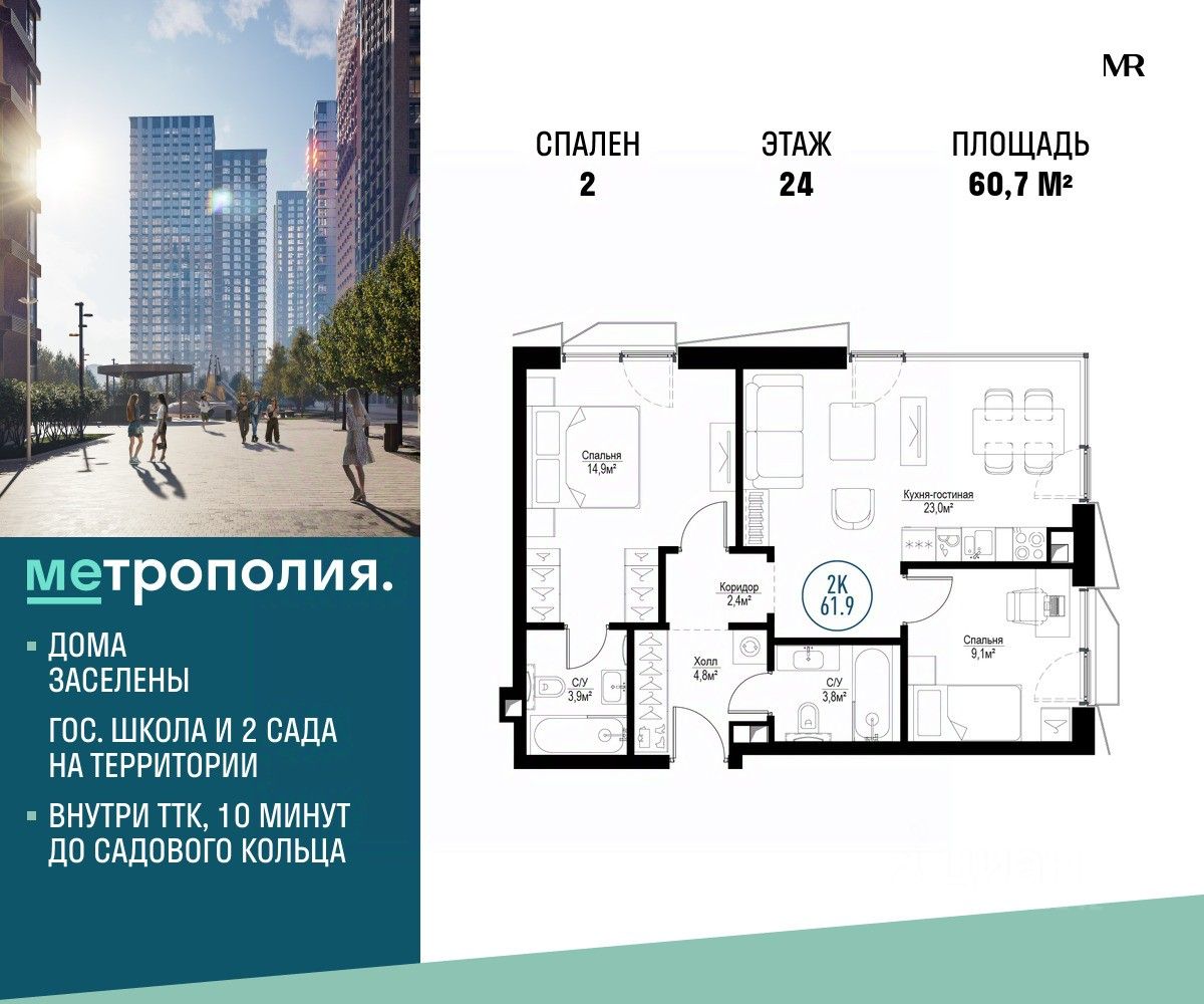 Продаётся 2-комнатная квартира общей площадью 60.70 м², на 24 этаже.