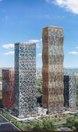 Состав комплекса: 5 разновысотных башен (от 23 до 55 этажей), объединенных стилобатом.