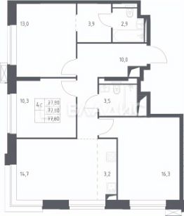 В продаже 3 ком квартира с чистовой отделкой от застройщика общей площадью 77,4 м2 на 13 этаже из 14.