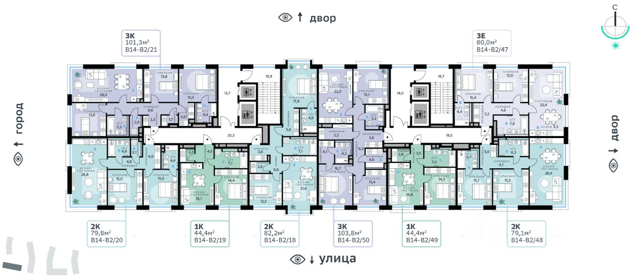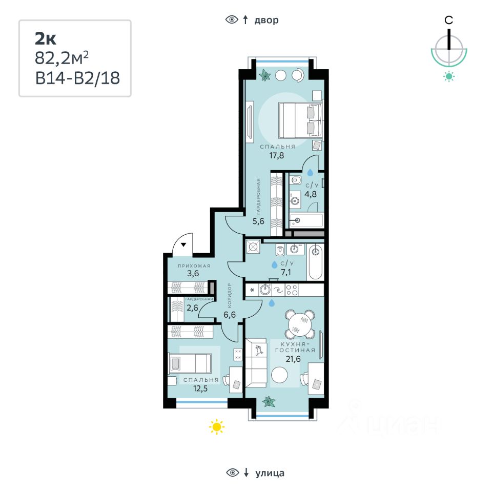В продаже — двухкомнатная квартира, общей площадью 82,2 кв. м. Квартира расположена на шестом этаже девятиэтажного корпуса Балансд в квартале В14 нового района СберСити, который строит Сбер.