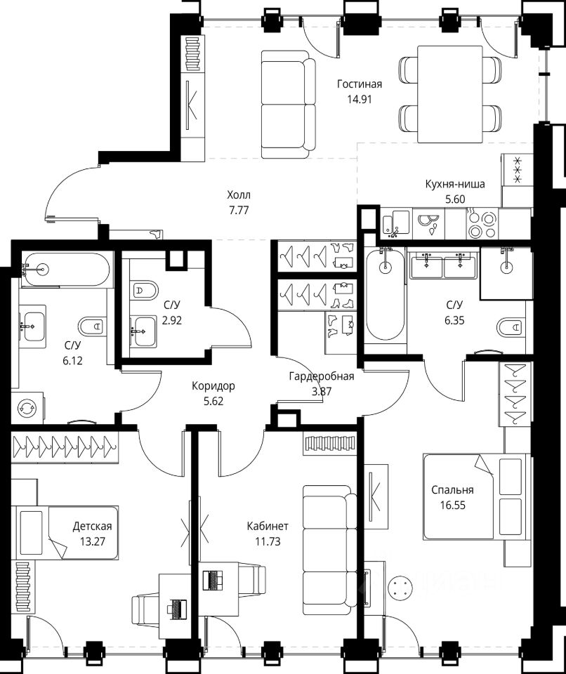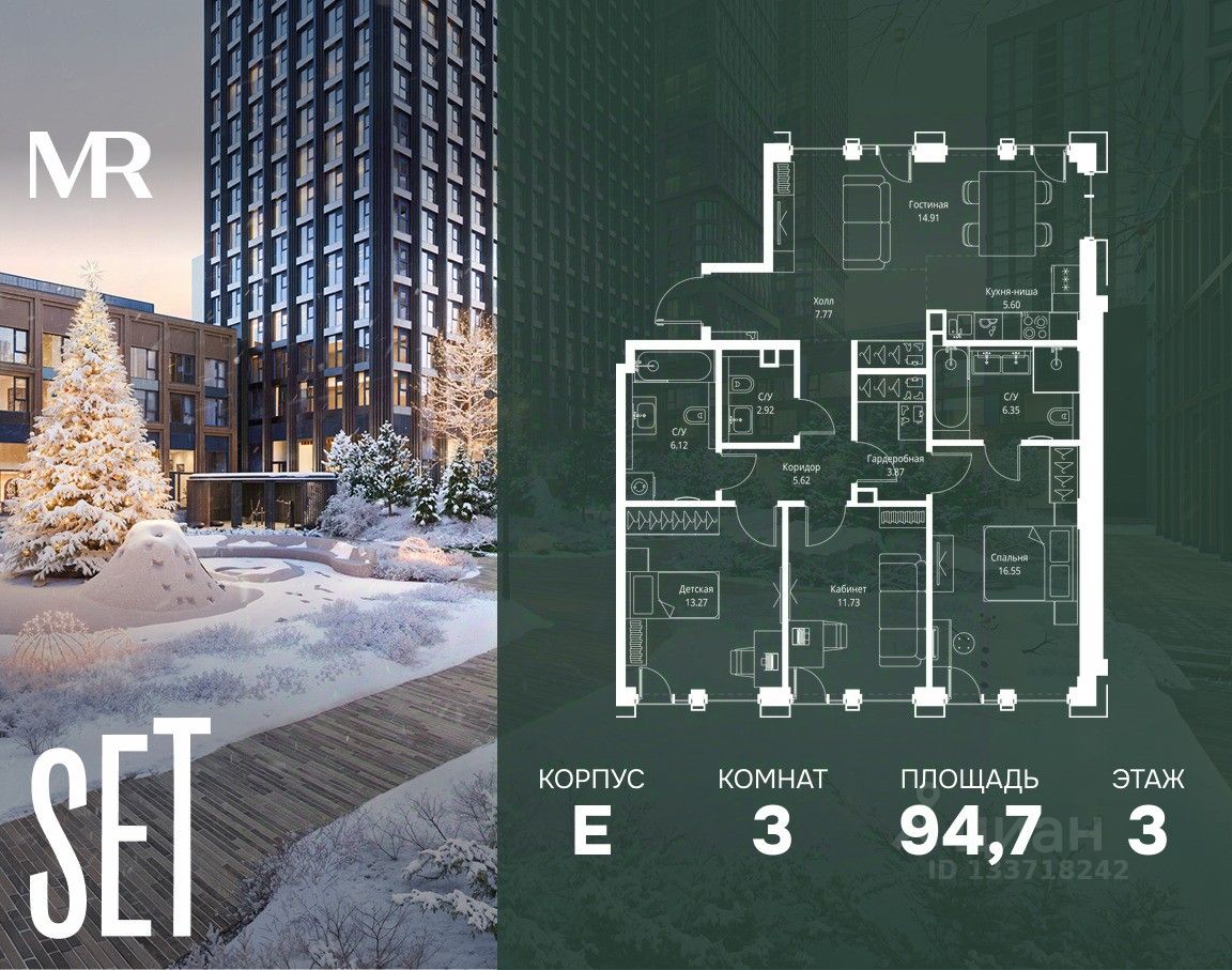 В ЖК SET продается 3-комнатная квартира площадью 94.71 м², расположенная в корпусе Е, на 3 этаже 8 этажного дома.