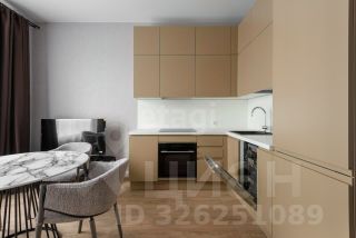 Интерьер выполнен в светлых тонах в стиле современной классики. В просторной кухне-гостиной установлены кухонный гарнитур, обеденная группа и комфортный диван с мягкой обивкой. В отдельной спальне размещены кровать, прикроватные тумбы, рабочий стол и комод с зеркалом. Вся техника также предусмотрена в квартире: духовка, посудомоечная и стиральная машины, холодильник, телевизор. Система хранения в отдельной гардеробной комнате.