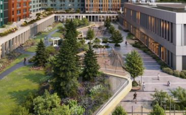 Территория комплекса будет хорошо благоустроена, будет выполнено ландшафтное озеленение — имеется гранд-лобби, 3 зоны коворкинга, детский сад, школа.