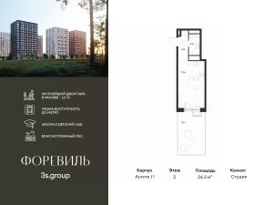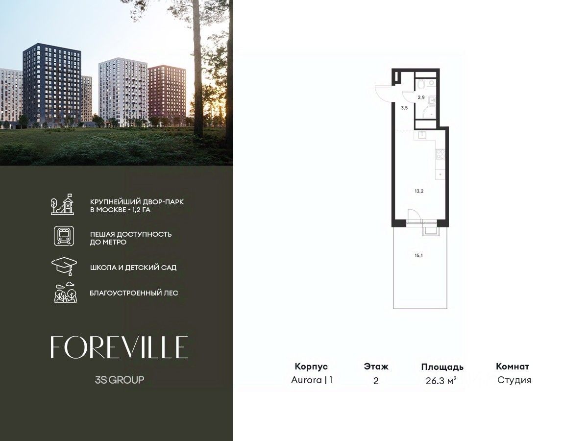 Продается уютная 1-комн. квартира площадью 26,3 кв.м на 2 этаже 17 этажного жилого комплекса бизнес-класса Foreville от 3S Group.