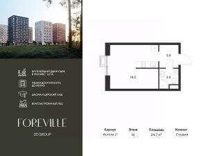 Продается уютная студия площадью 24,7 кв.м на 16 этаже 17 этажного жилого комплекса бизнес-класса Foreville от 3S Group.