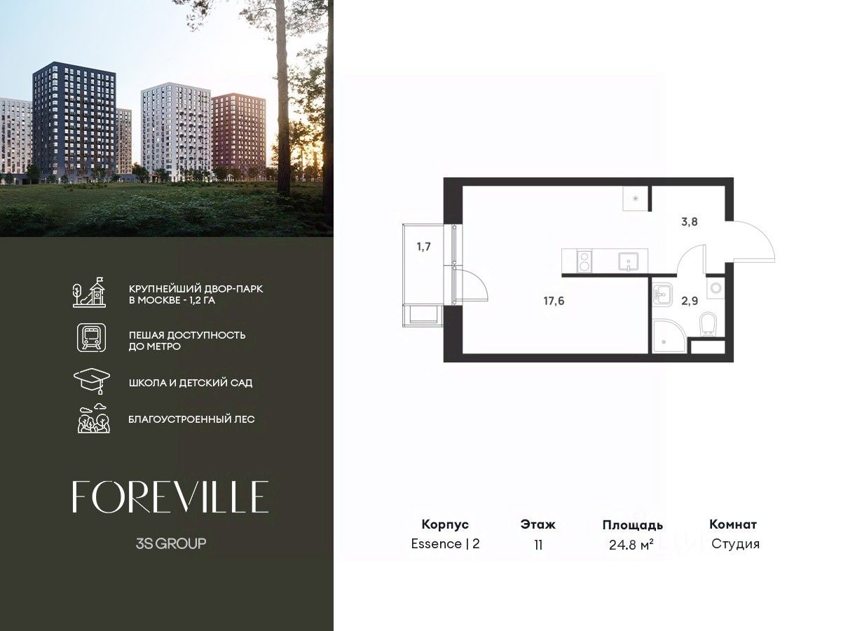 Предчистовая отделка в подарок! Пешая доступность от метро и московская прописка! Продается уютная 1-комн. квартира площадью 24,8 кв.м на 11 этаже 17 этажного жилого комплекса бизнес-класса Foreville от 3S Group.