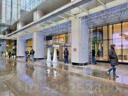 Имеет несколько входов: центральный — со стороны набережной, есть пешеходные переходы, соединяющие "Москву" с ТЦ "Афимолл", и выходы с подземной стоянки.