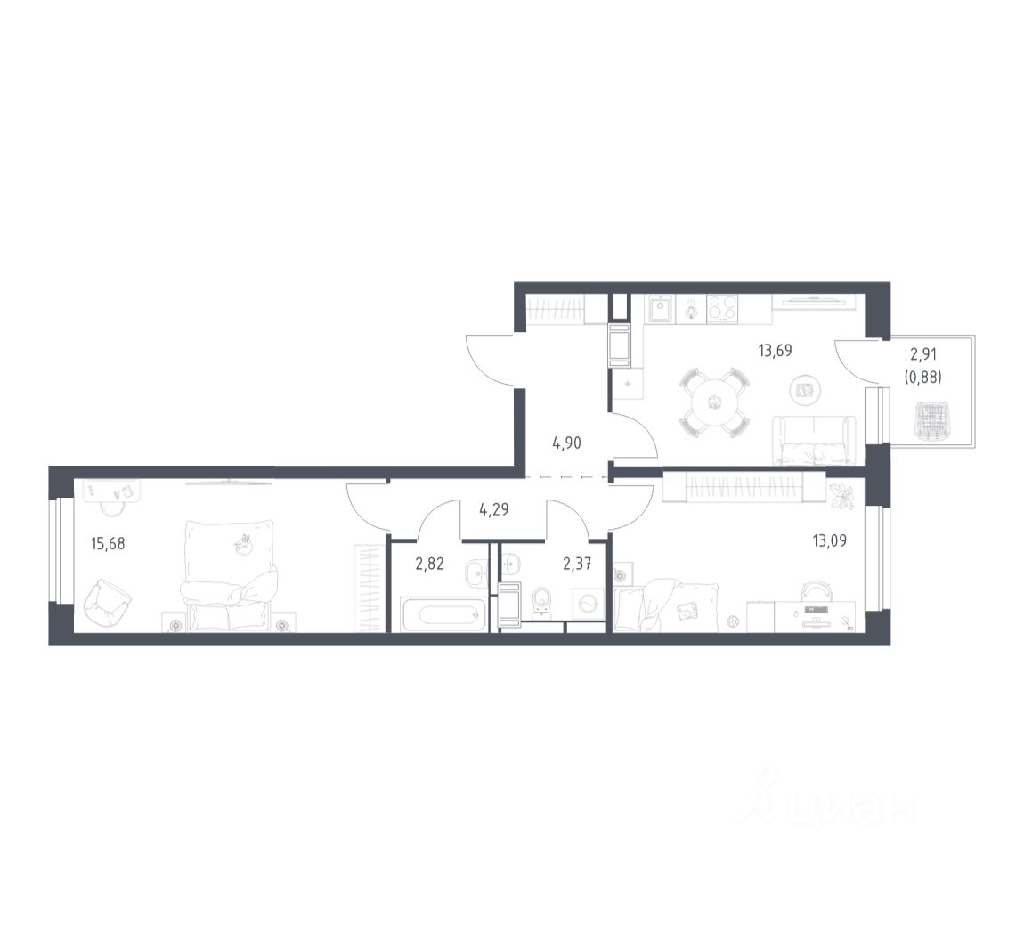 Строим кварталы для жизни с заботой о будущем. Предлагается 2-комнатная квартира комфорт-класса площадью 57,8 кв.м в корпусе 13 на 5-м этаже, в жилом комплексе "Алхимово".
