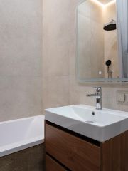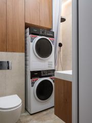 Совмещённый санузел оборудован ванной, стиральной и сушильной машиной.