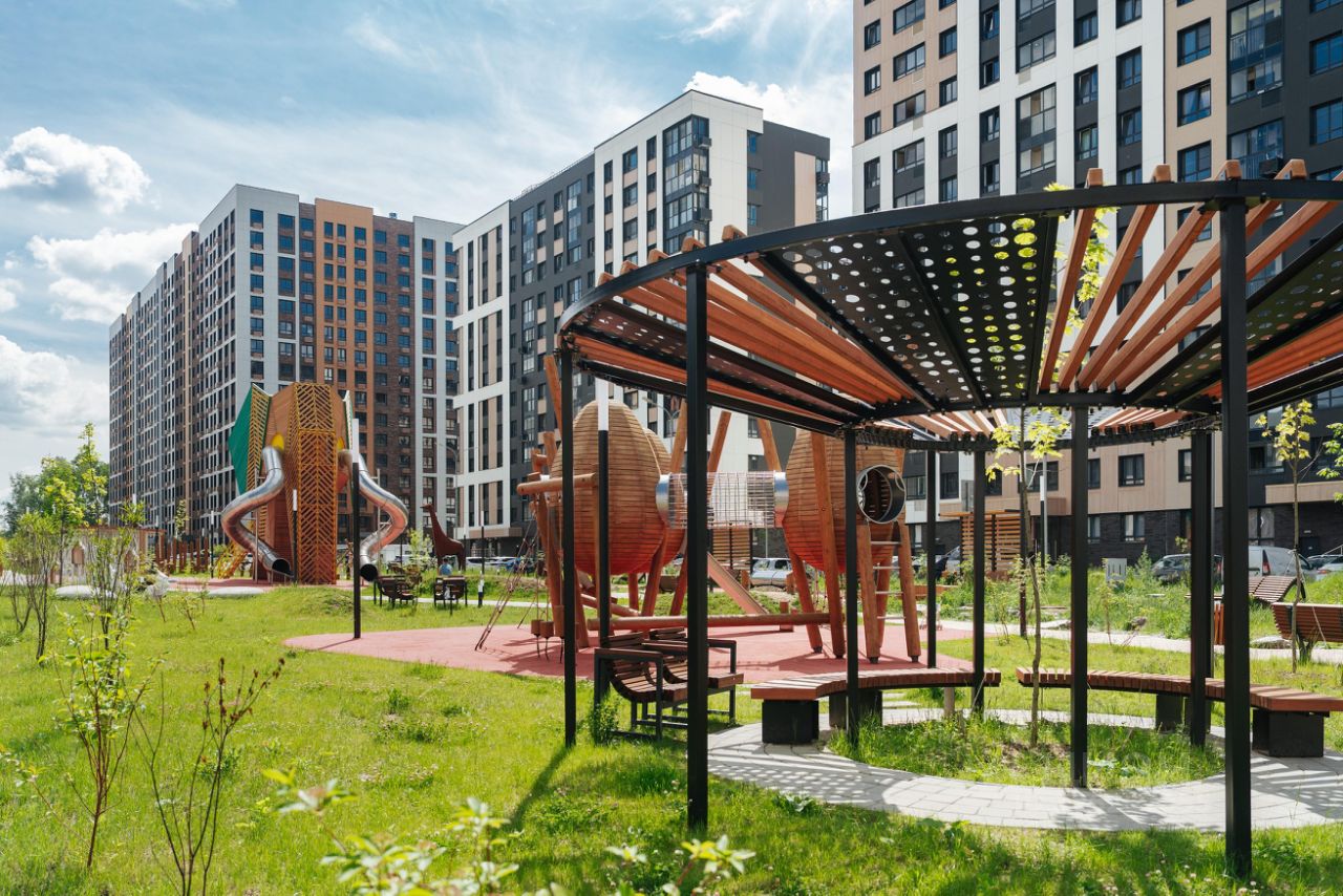 Во дворах-парках, закрытых от машин, комфортно и безопасно гулять. Здесь высажены уже взрослые деревья, которые создают прохладную тень в жаркий день.